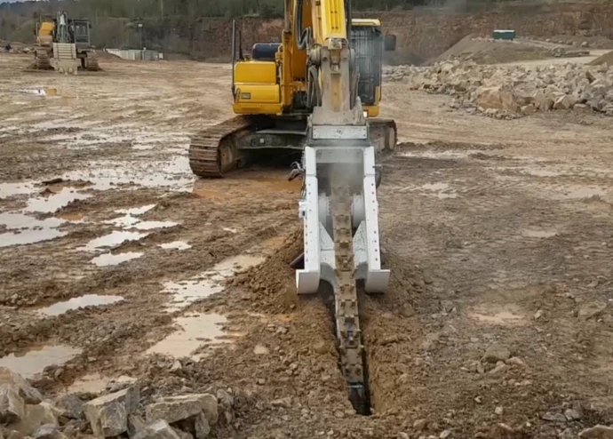 Fraise hydraulique pour tranchée en roche sur pelle hydraulique